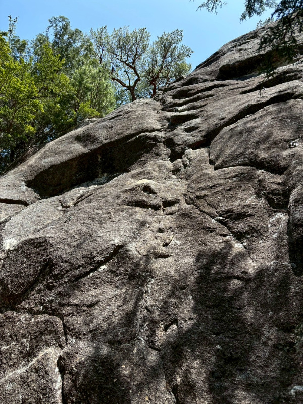 岩がやや脆い。クラックは細いが持ちやすい。上部は岩の裏側に回り込んで終了点へ(3ルート共通となっている)。