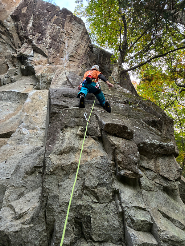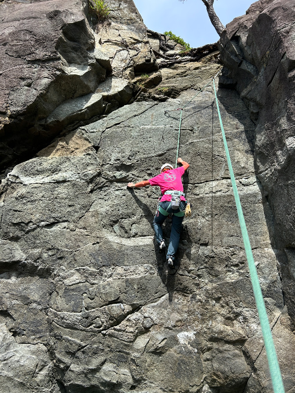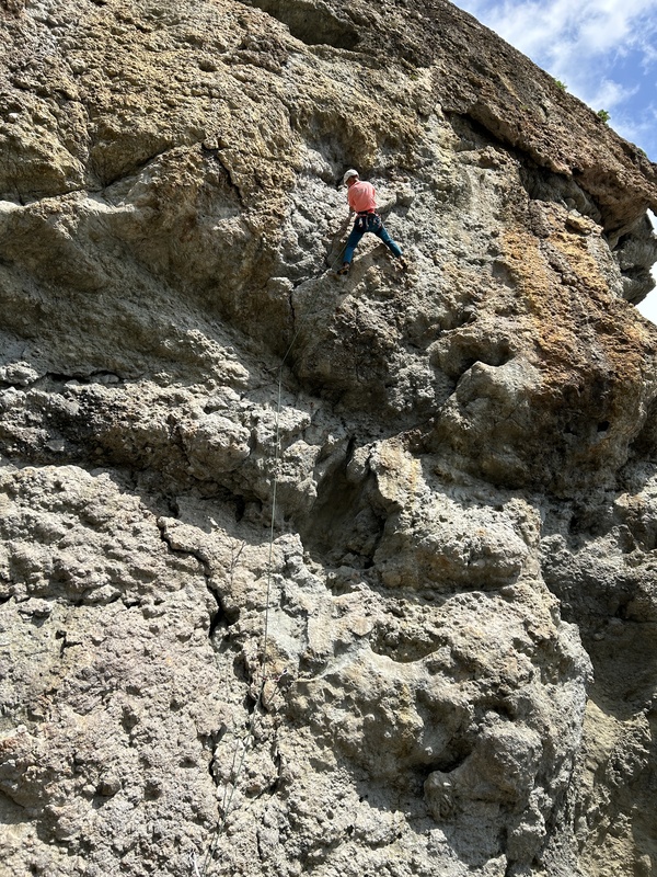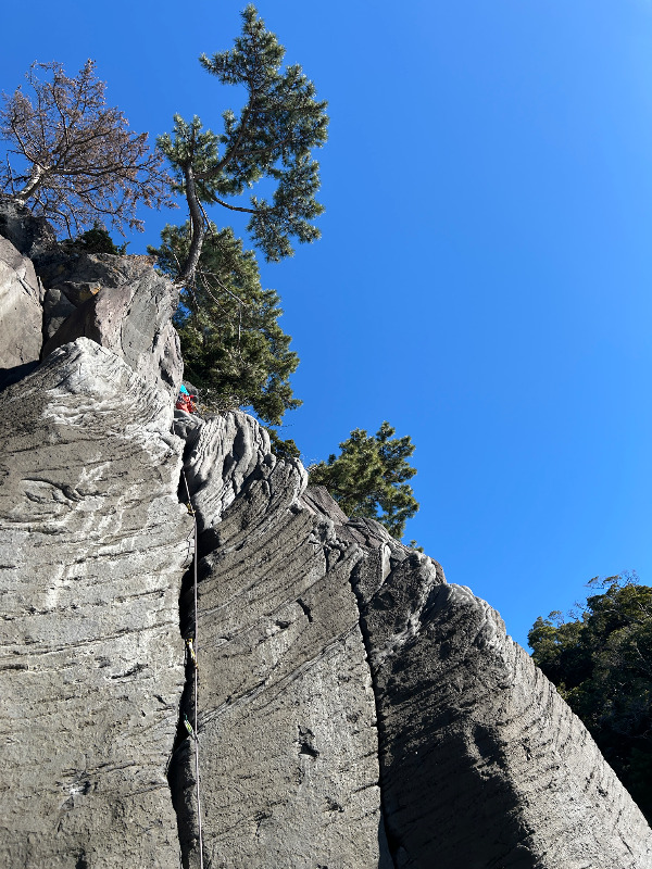 地合の岩場で最初に登られたライン。下部のガバからハングをダイナミックに越えて終了点へ。ルートは分かりやすく登りやすいです。