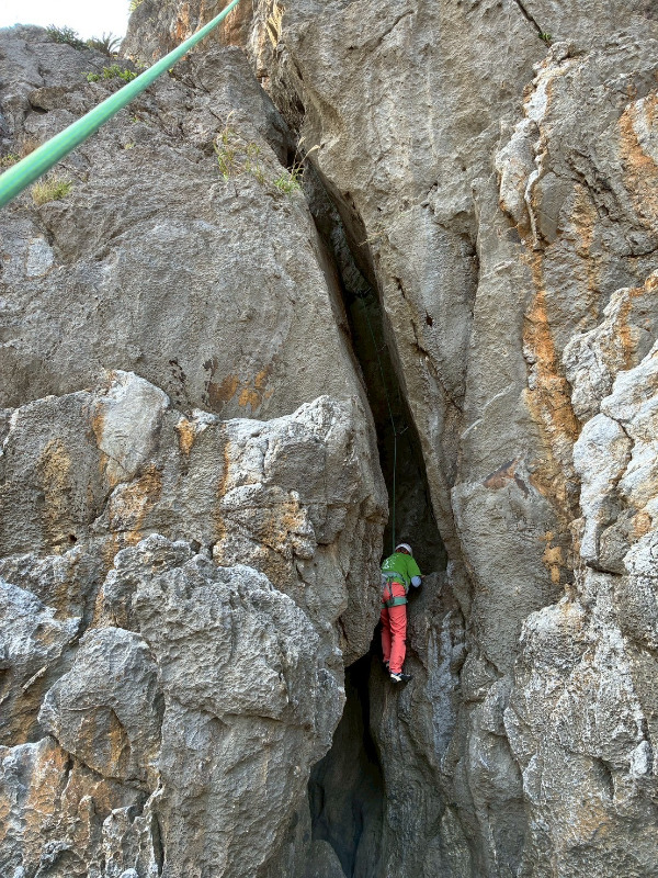 出だしは中間部付近にあるテラスから。ビレイポイント用のハンガーあり。濡れていることが多い?クラックは琉球石灰岩らしく痛いです...