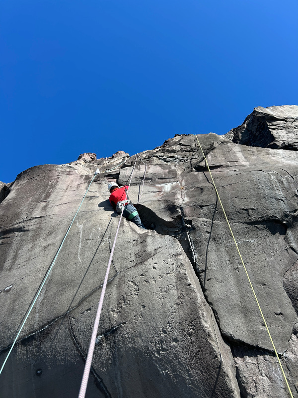 毎回アップで登るルート。でも朝一1本目はかなり怖い。 核心部は右のカンテやクラックを使わずに登るらしいが、朝一は怖くて逃げ...