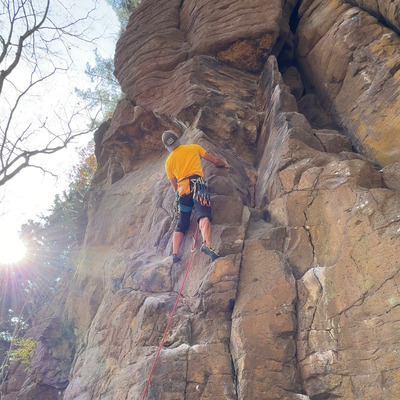 案内通り上部が悪くホールドを見つけられず隣のチョックストーンをチムニー登りで抜けてしまいました。も...