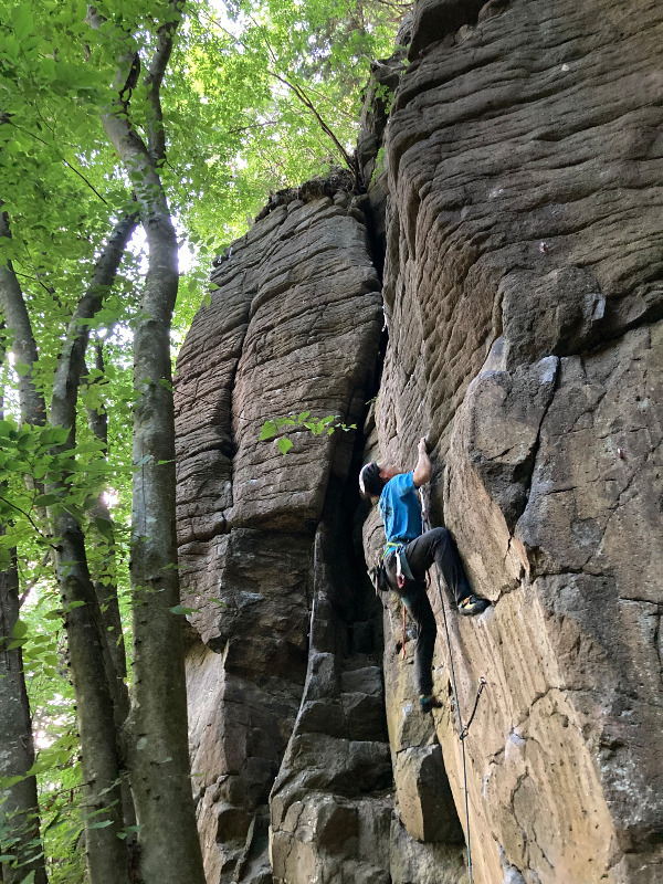 下部は立体的で楽しい。ハングをまっすぐもいけるし右からもいける。核心超えたら一度座れるほどのテラス...