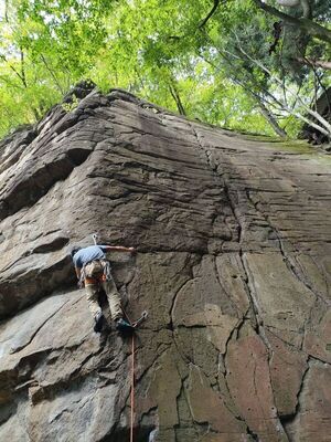 カンテ沿いに登る見栄え良いルート。特に厳しいムーブは有りませんが、長いので繋げるとヨレてきます。最...