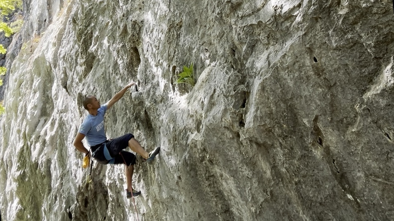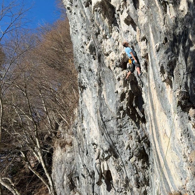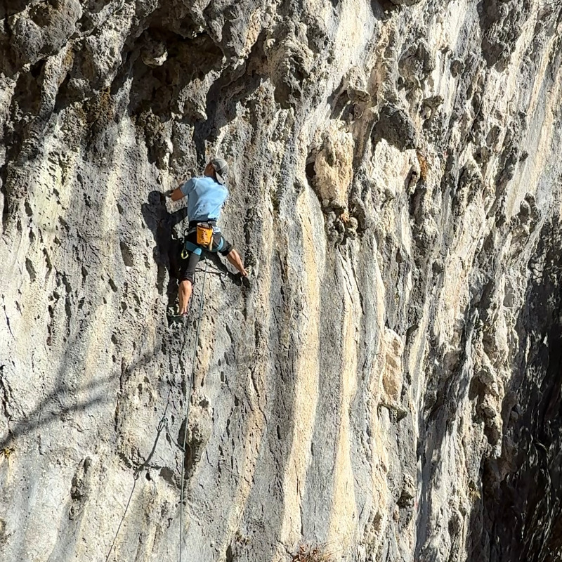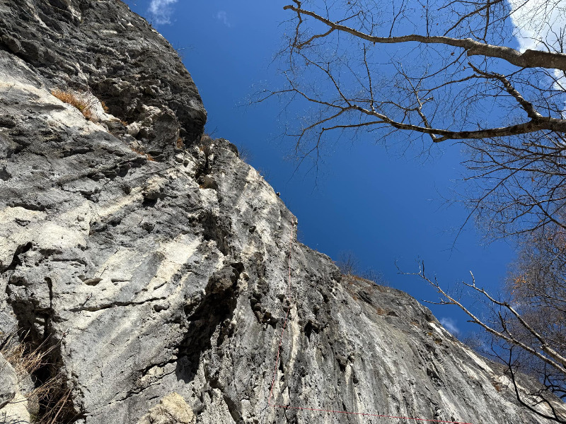 二段岩壁の右端。二階に登るためのフィックスの脇を登ります。しっかり核心があって、腕がパンパンになります。
