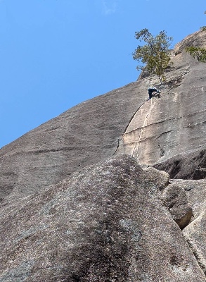 目立つ張り出した岩や上部凹角など立体的なクライミングが楽しめる好ルート。