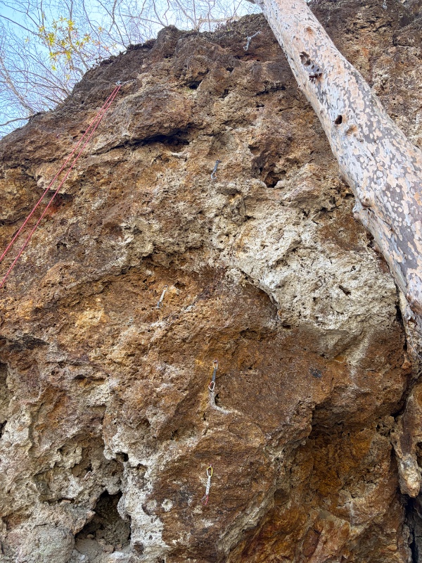 パワフルなハング超えムーブです。意外と足置きはルーズでも行けるので気持ち良く登れるルートだと思います。終了点はボルト2点。展...