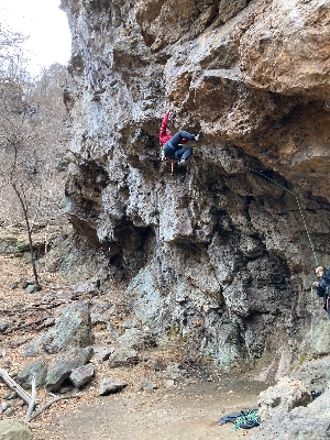 天の川の左隣のルート。天の川のように鉱脈状のホールドを登りますが、こちらは明らかにホールドが少ない上、向きがあり、なかなか素...
