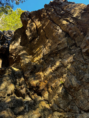 日和田山女岩の中では比較的簡単なルートですが、棚から先の前傾でグレード表記の5.10bよりは難しく感じるように思います。冷静になれば手も足もかなりあるので問題ないと思いますが、消耗してくるとやられます。