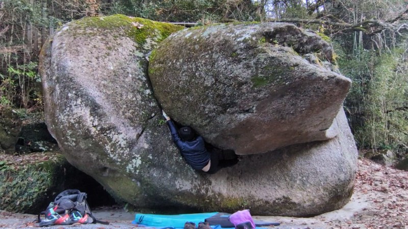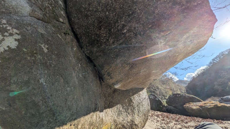 YouTubeの動画ではクラックの縁をアンダーで持って攻略する方が多いですが、もう一段階奥まで手を伸ばしてジャミングで登ってみました。一応?ルーフクラックになるでしょうか。バチ効きのハンドジャムでルーフ出来る、面白い課題でした。