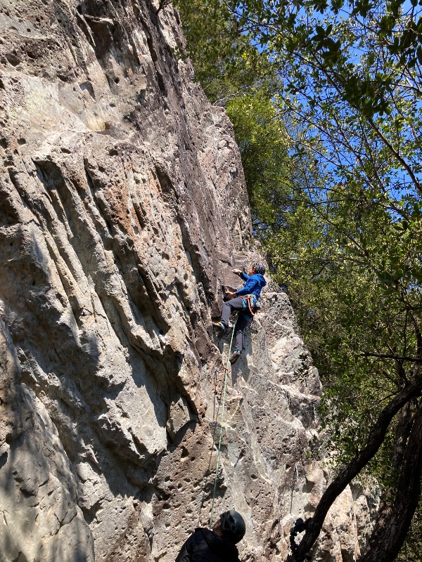 ボルト1本目はプリクリが無難か。傾斜を感じるが、ポジティブなホールドが続き登りやすい。