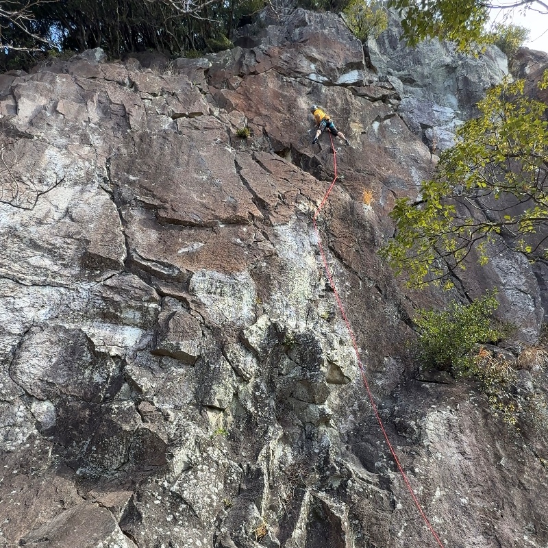 名前の由来のハングもさることながら、そこに至るまでのフェイスも適度に悪く、とても面白いルートです。1ピン目が高いので、出だしのフレークにカム(C#0.5)を使いました。