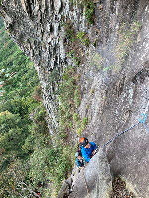 ノーマルルートを登りました。全体的にスッキリした岩壁で、各ピッチ、グレードは手頃ですが、それぞれ個性があり、しっかりとクライミング要素が詰まっていて、高度感ある絶景を楽しみつつテンション保ったまま岩頭に至る好ルートでした。