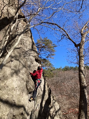 大信フェイスの中央を弱点をついて登る。左トラバース後に段差を越えるあたりが少々悪い。