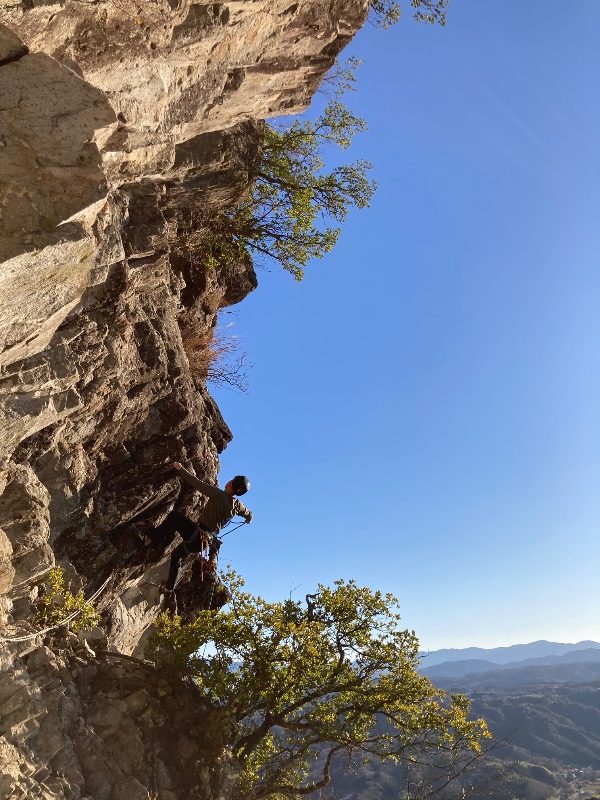 圧倒される強傾斜壁をポジティブなホールドを繋いでダイナミックに登る好ルート。