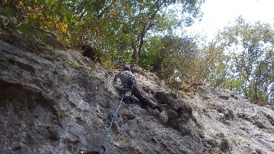 エリア左端から2番目のルート。取り付きは車道前広場から左に上がる。ルートは右上して行くがムーブもありそこそこ吸われます。
