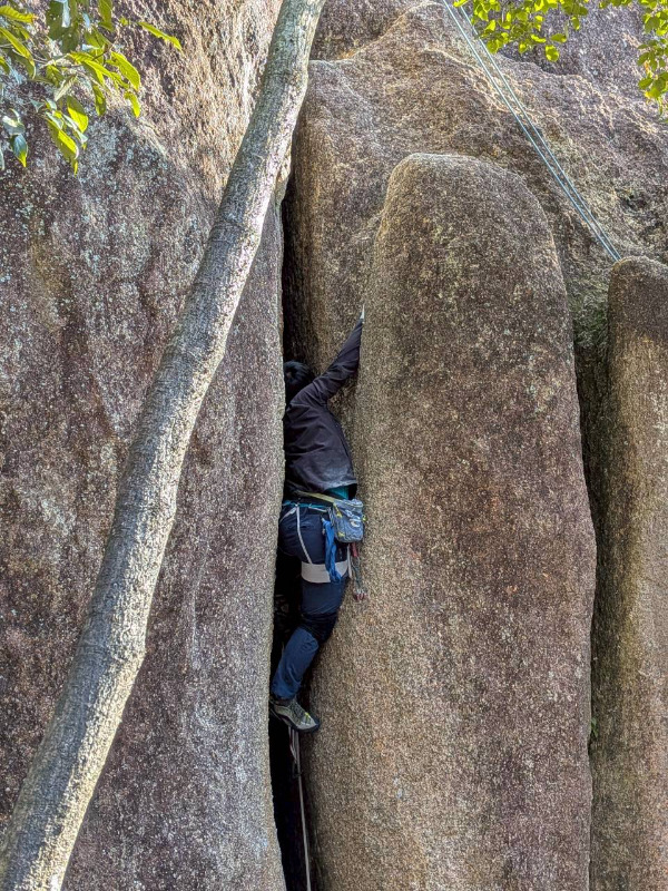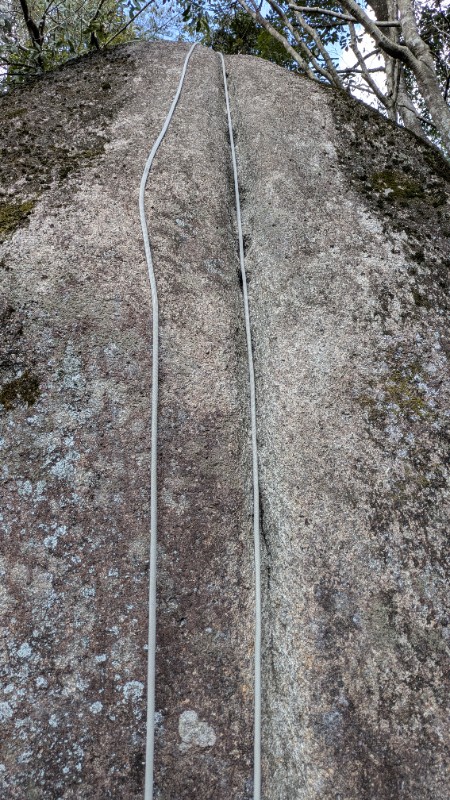 フレアしたクラックから左上するクラックへ乗り移り最後はスラブてす。個人的にはクラック部分よりスラブが核心で、スラブへの離陸が怖かったです。そして、その箇所のリングピンが錆びて腐ってて本当に怖かった!終了点はラッペルリングで上部のスラブも寝てるので懸垂が良いかと。ビレイ点は川があってやりにくいです。