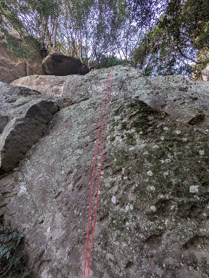 上部はカチと小カバを使って小ハングを越えていく。フットホールドが乏しく、足の踏み場に困る。ワイルドボアには少なく、一味違う薄いカチを繋げて行くルート。細かい系が得意な人、被りが苦手な人はこちらをおすすめ。上部はリーチある人は指が1、2本はいるポケットを使って登っていく。リーチによって効かせるホールドが異なる。