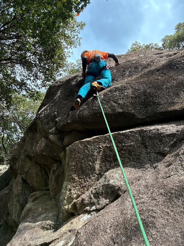 細かい価値を繋いで岩頭まで。 この岩場の初登ルート。 ロープが岩角に擦れるため、終了点から懸垂...