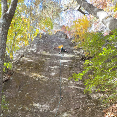 ルート名の通り、落ち葉の季節に登ると紅葉が綺麗な、顕著な穴が目印のとても特徴的ルートです。細かい核...