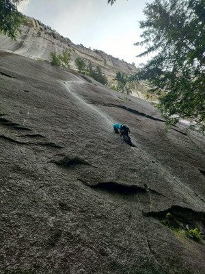 体感70-80°くらいの緩傾斜のフィンガークラック。要所要所にパッシブに指が決まる葉っぱ型のクラックの広がり(ピトンスカー?...