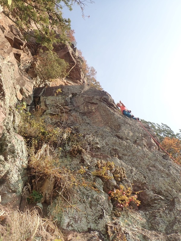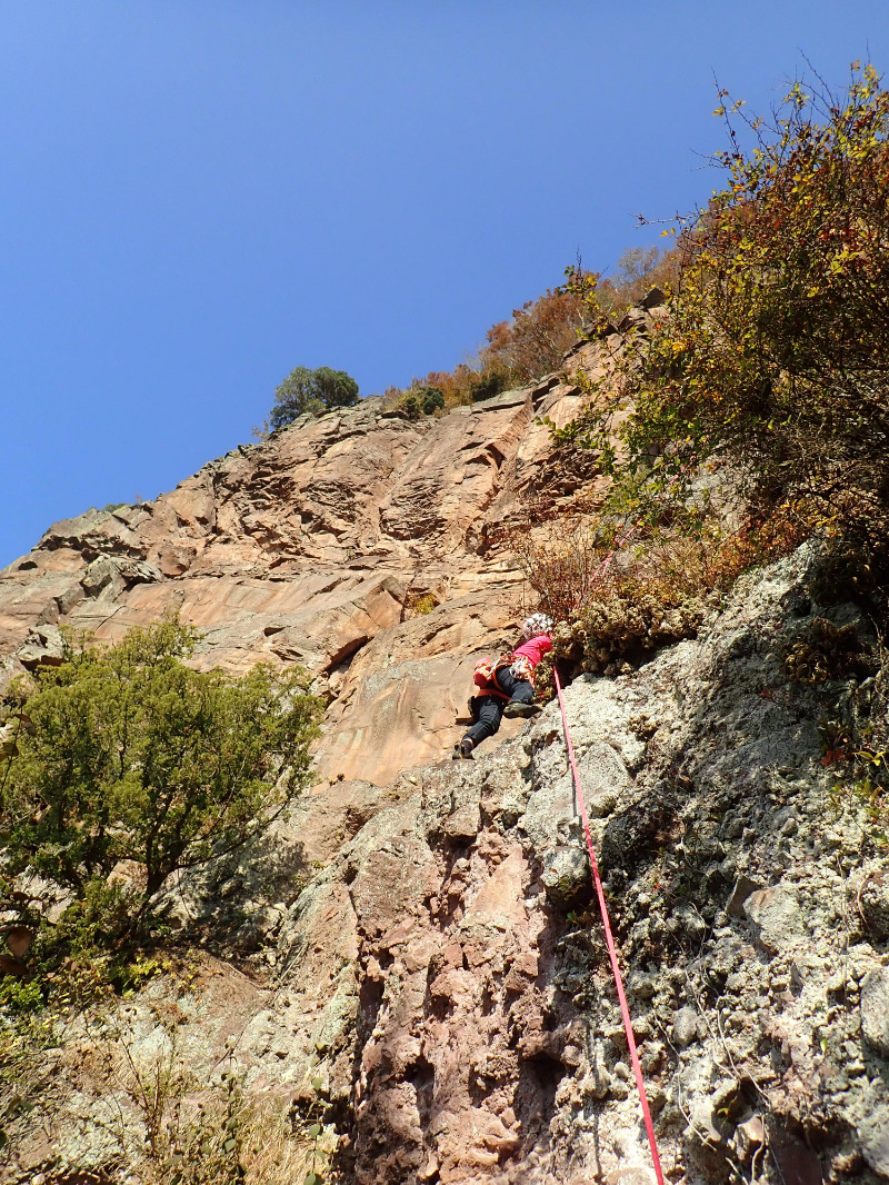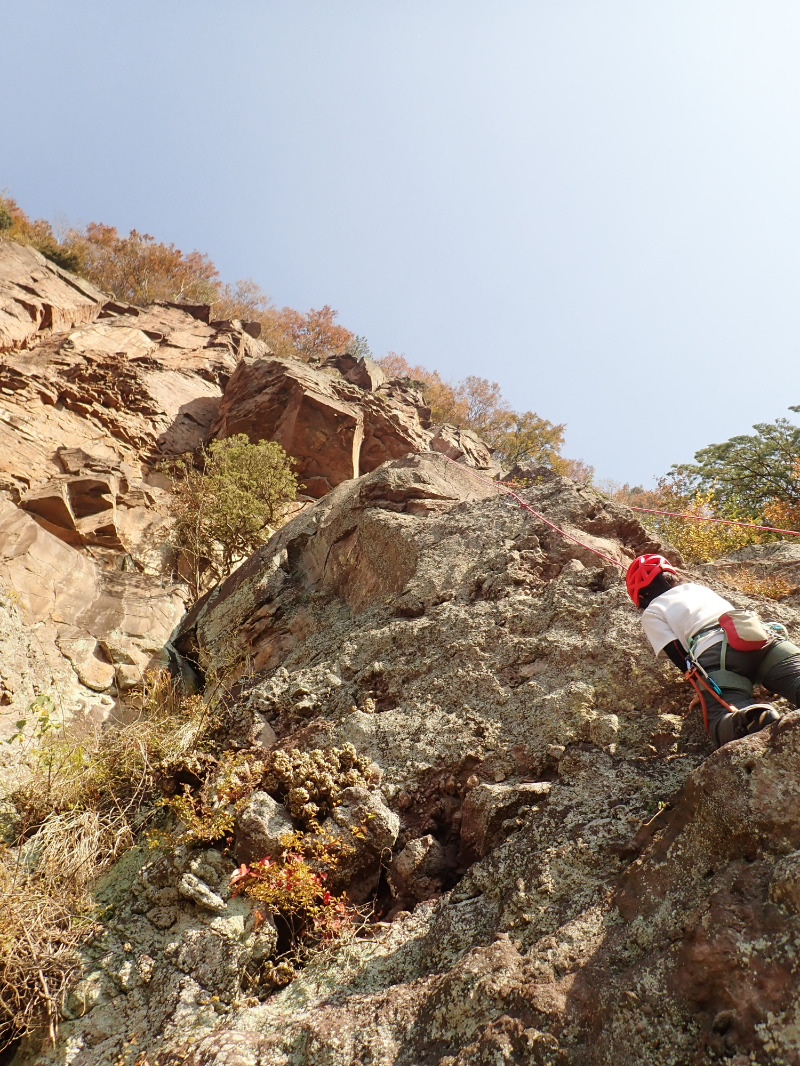 出だしは礫岩のホールドを使いながら登っていく。傾斜が緩くなって、右にまだボルトが続いては居るが、そ...