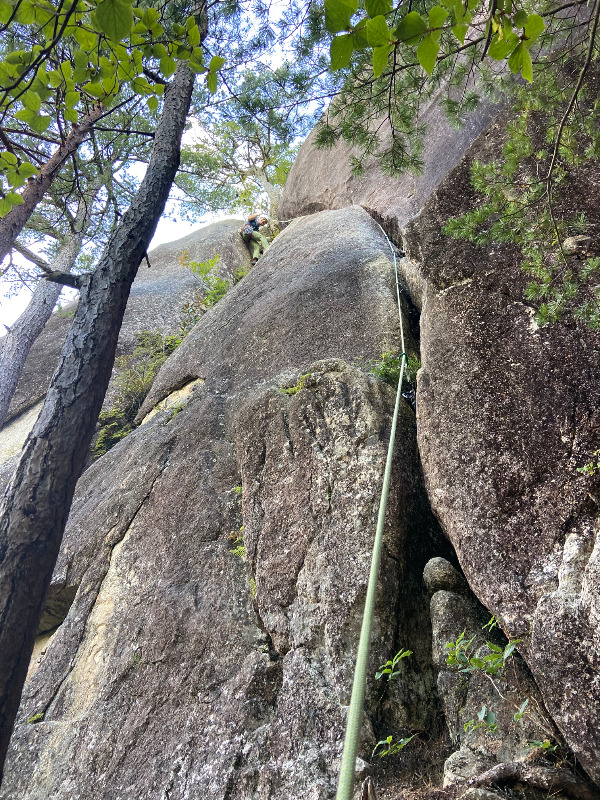 下から見ると簡単そうに見えるが、取りついてみると結構悪い。 斜上してるフレアで掛かりの悪いワイドハンド、手が小さいと難しい...