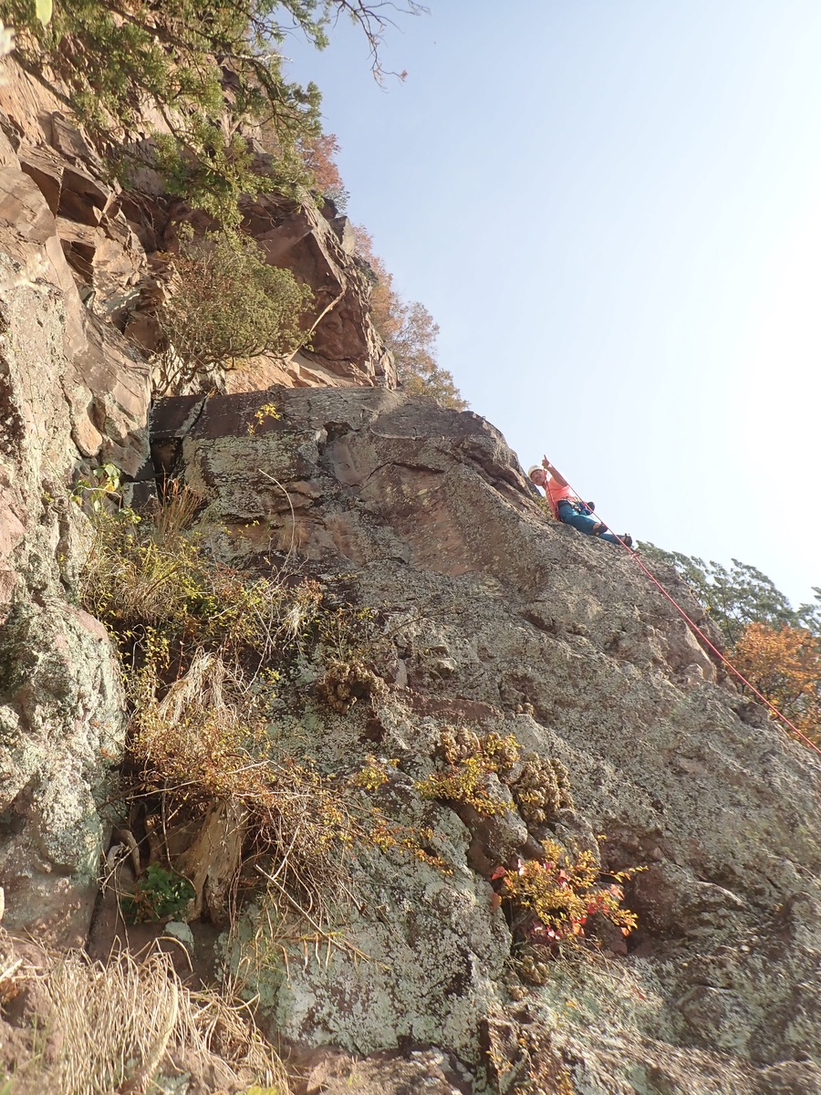 出だしは礫岩のホールドを使いながら登っていく。傾斜が緩くなって、右にまだボルトが続いては居るが、それは船中八策のボルト&終了...