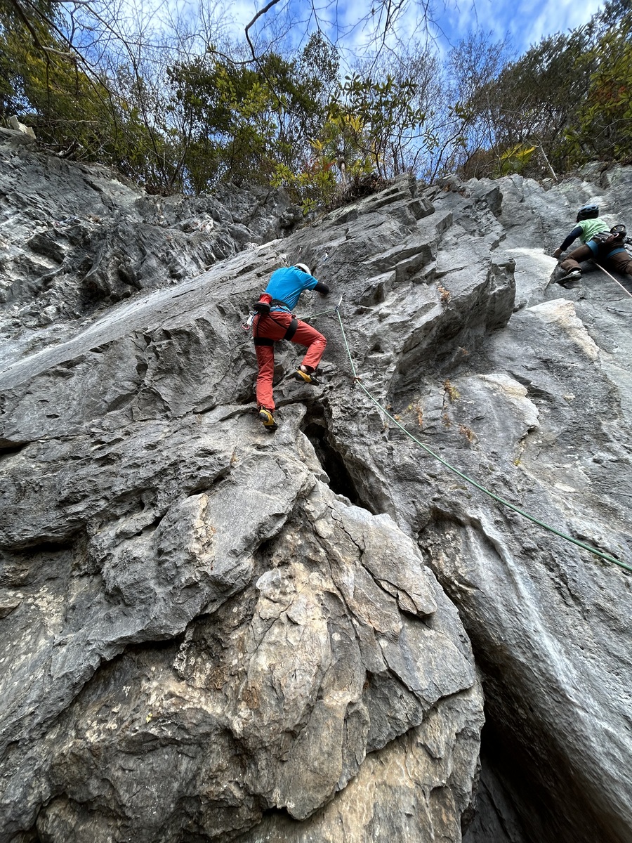 スタートは傾斜ある壁をポジティブなホールドでグイグイ登り、やや寝たフェイスに出てからは足捌きが求められる好ルート。