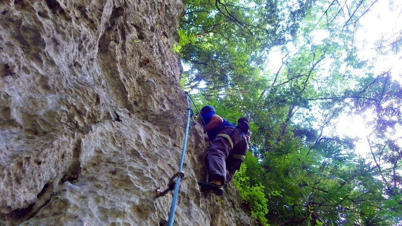 神社エリア奥の一番右側のルート。ホールドは良い。下部の風穴から冷風が出ていて夏でも涼しい。