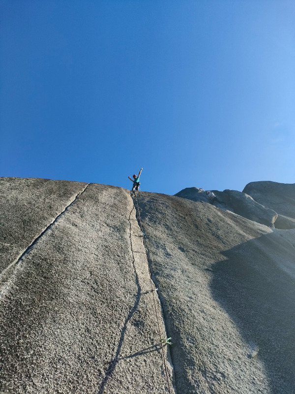 体感70-80°くらいの緩傾斜のフィンガークラック。要所要所にパッシブに指が決まる葉っぱ型のクラックの広がり(ピトンスカー?...