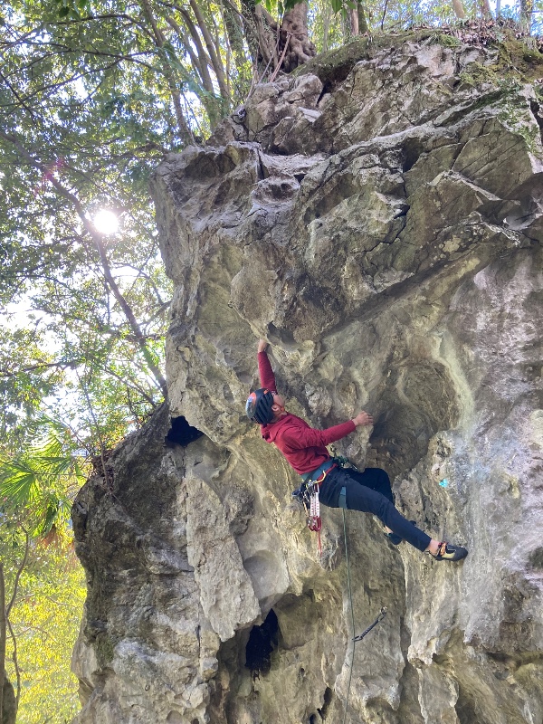 鍾乳洞のような立体的な壁を登ります。上部使い難いヘソの穴からが核心。