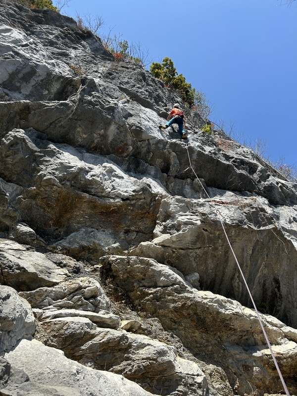 2年前にMOSを逃し、ワンテントップアウトしていた。この日の1トライ目で、過去と同じ場所でワンテン。2トライ目でヒーヒーでRP。確信はハング越えで終わりでなく、上部にもあり。