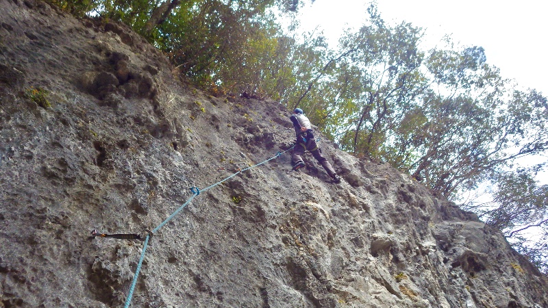 エリア左端から2番目のルート。取り付きは車道前広場から左に上がる。ルートは右上して行くがムーブもありそこそこ吸われます。