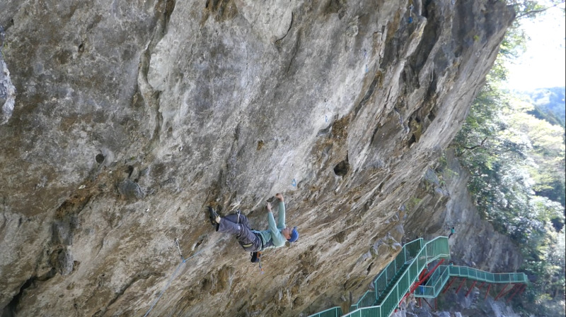 45度近い強傾斜を登っていく。傾斜が緩むまでレストポイントはなく、短いながら持久系。 ムーブを組み立てればどんどん楽になる...