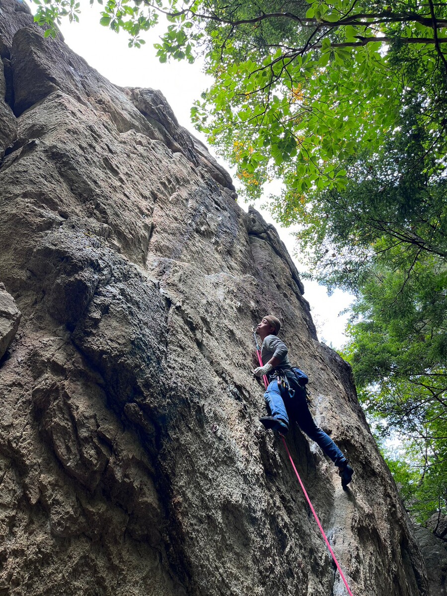 下部確認。人によって下でトラバースするか上でするかわかれる。自分は上からで極小カチを使ってトラバース。その後も気持ちよいフェースクライミングができた。上部でハンドジャムでレストできる。